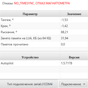 В правой части программы появится телеметрия платы автопилота, имя отказа находится напротив надписи «Отказы».